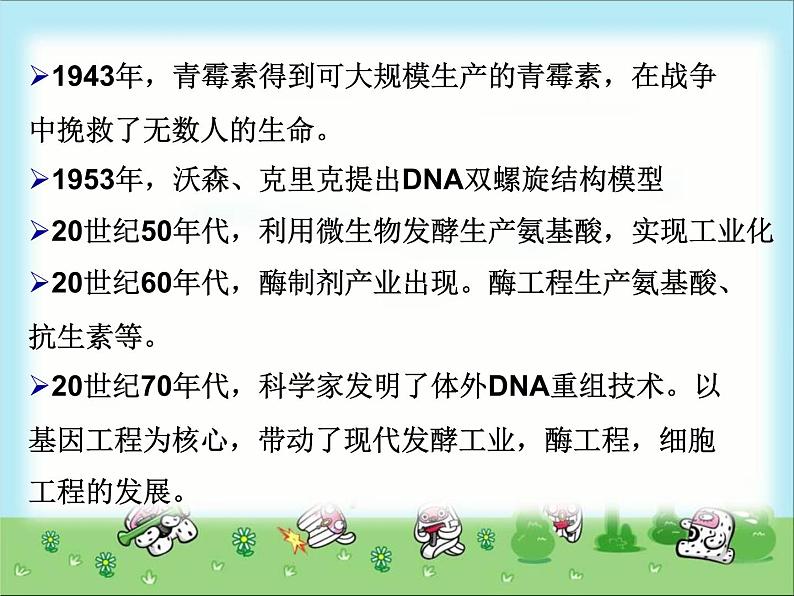 1943年,青霉素得到可大规模生产的青霉素,在战争中挽救了无数人的生命。1953年,沃森、克里克提出DNA双螺旋结构模型20世纪50年代,利用微生物发酵生产氨基酸,实现工业化20世纪60年代,酶制剂产业出现。酶工程生产氨基酸、抗生素等。20世纪70年代,科学家发明了体外DNA重组技术。以基因工程为核心,带动了现代发酵工业,酶工程,细胞工程的发展。