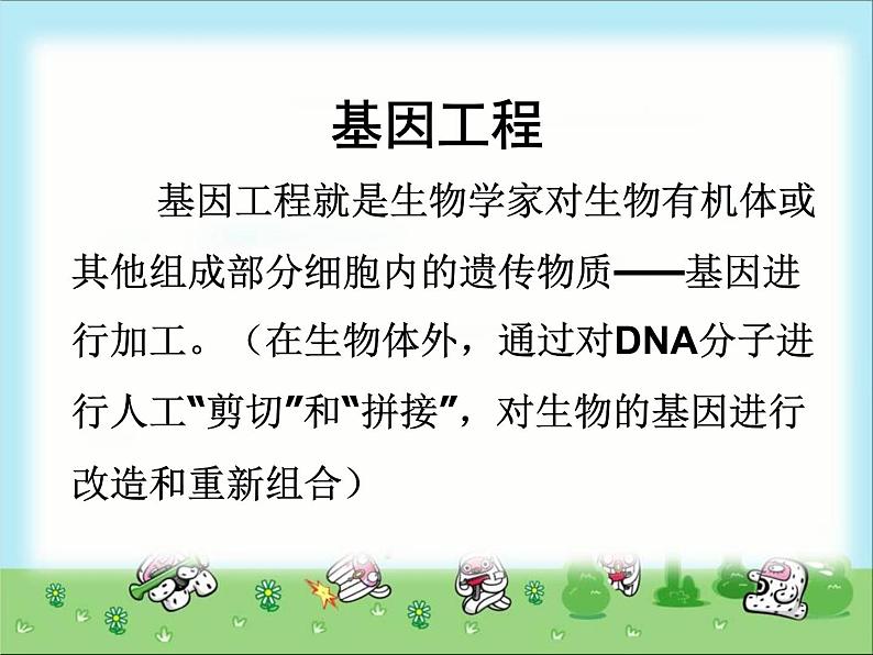基因工程就是生物学家对生物有机体或其他组成部分细胞内的遗传物质——基因进行加工。(在生物体外,通过对DNA分子进行人工“剪切”和“拼接”,对生物的基因进行改造和重新组合)