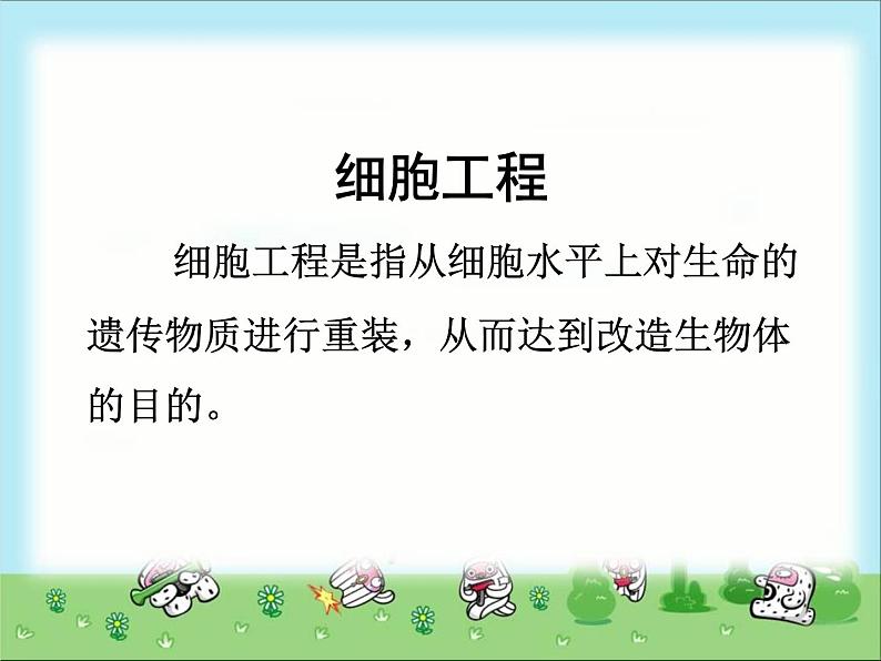 细胞工程是指从细胞水平上对生命的遗传物质进行重装,从而达到改造生物体的目的。