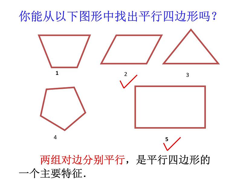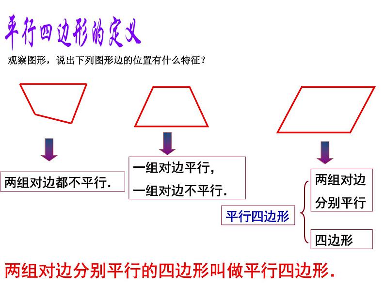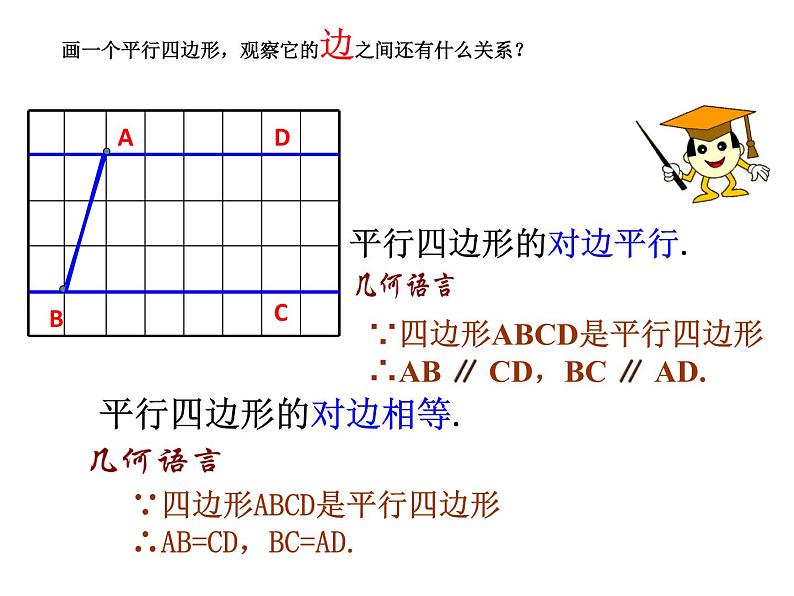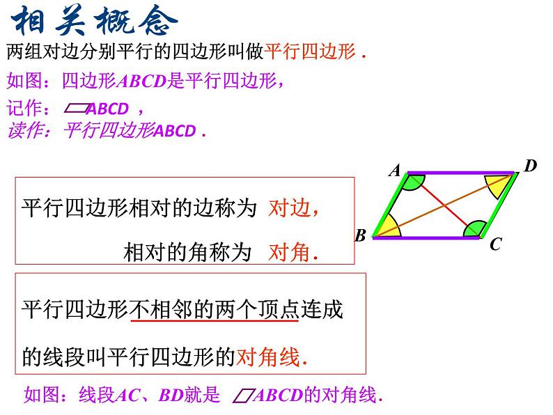 平行四边形相对的边称为 对边, 相对的角称为 对角.