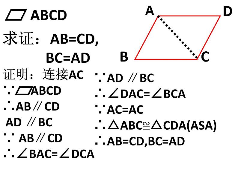 ∵AD ∥BC∴∠DAC=∠BCA∵AC=AC∴△ABC≌△CDA(ASA)∴AB=CD,BC=AD