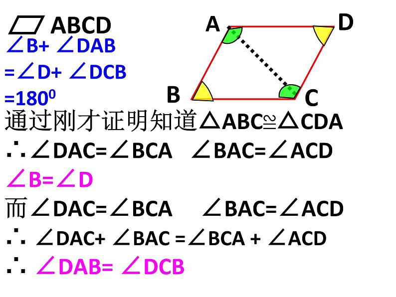 通过刚才证明知道△ABC≌△CDA∴∠DAC=∠BCA ∠BAC=∠ACD ∠B=∠D而∠DAC=∠BCA ∠BAC=∠ACD ∴ ∠DAC+ ∠BAC =∠BCA + ∠ACD ∴ ∠DAB= ∠DCB