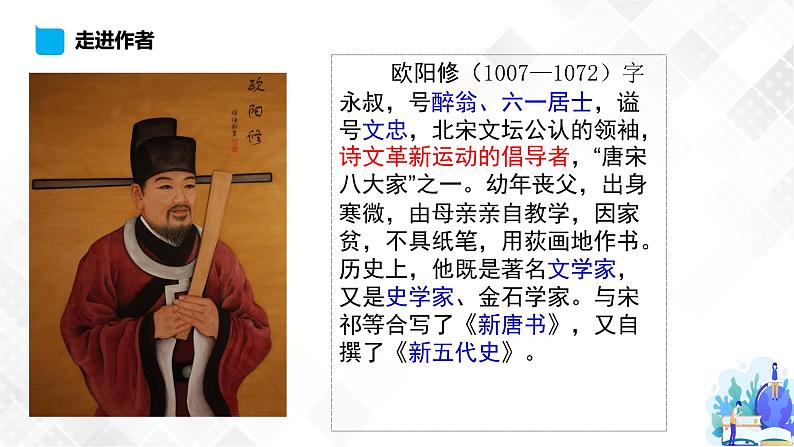 高中人教统编版11.2 *五代史伶官传序完美版ppt课件: 这是一份高中人教统编版11.2 *五代史伶官传序完美版ppt课件,共37页。PPT课件主要包含了功名事业三朝相,道德文章万事师,北宋欧阳修,伶官传序,文化常识积累等内容,欢迎下载使用。
