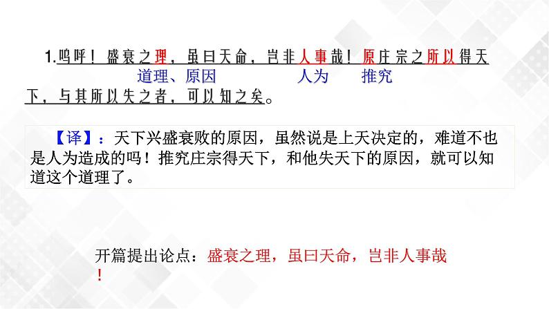 A.开头提出盛衰由于人事的论点,并举出后唐庄宗得天下而又失天下的事例作为全文立论的根据,也为下文定下了感情基调。