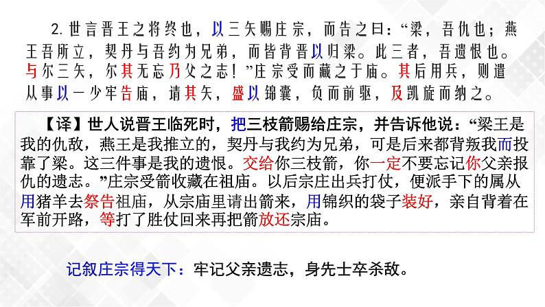 A.梁/吾仇也/燕王吾所立契丹/与吾约为兄弟/而皆背晋以归梁/此三者/吾遗恨也/与尔三矢/尔其无忘乃父之志/庄宗受而藏之于庙