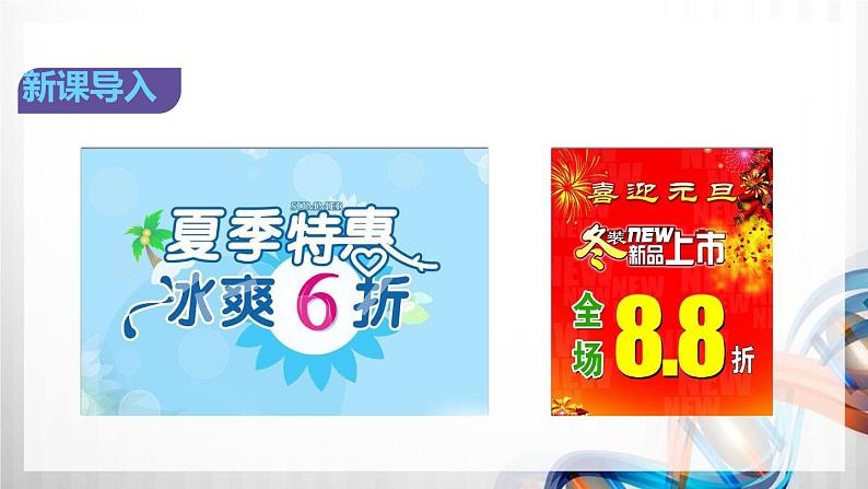 2.1《折扣》2.2《成数》2.3《税率》2.4《利率》2.5《解决问题》练习二综合实践活动 生活与百分数第二单元 百分数(二)人教版六年级数学下册2.1《折扣》第二单元 百分数(二)人教版六年级数学下册R·六年级下册折 扣什么是“打折”?几折表示什么? 商店有时降价出售商品,叫做打折扣销售,俗称“打折”。 几折就表示十分之几,也就是百分之几十。九折八五折例如:打九折出售,就是按原价的90%出售。“八五折”表示什么意思? 表示( )是( )的( )%。现价原价85九折八五折“五折”表示 ( ) 是 ( ) 的 ( ) %。现价原价50“七五折”表示 ( ) 是 ( ) 的 ( ) %。现价原价75“八七折”表示 ( ) 是 ( ) 的 ( ) %。现价原价87(1)爸爸给小雨买了一辆自行车,原价180元,现在商店打八五折出售。买这辆车用了多少钱?分析:八五折就是按原价的85%销售。现价=原价×85%单位“1”180×85%=153(元)答:买这辆车用了153元。(2)爸爸买了一个随身听,原价160元,现在只花了九折的钱,比原价便宜了多少钱? 160-160×90%= 16(元)思路一:先求现价,再求便宜的价钱。思路二:先求现价比原价便宜了百分之几,再求便宜的价钱。 160×(1 – 90%)= 16(元)答:比原价便宜了16元。 便宜的钱数 = 原价 – 原价×折扣或 便宜的钱数 = 原价×(1 - 折扣)算出下面各物品打折后出售的价钱。(单位:元)原价:80.00 原价:105.00 原价:35.00 原价×折扣=现价52.0073.5030.801.(1)打完折后,每种面包各多少元?1.5×50%=0.75(元)2.4×50%=1.2(元)1×50%=0.5(元)3×50%=1.5(元)(2)晚8:00以后,玲玲拿了3元钱去买面包她可以怎样买?2.晓风的爸爸妈妈去买新家具,他们选中了图中 的家具,打完折后,分别应付多少钱?120×80%=96(元)80×80%=64(元)400×80%=320(元)180×80%=144(元)3. 书店的图书凭优惠卡可打八折,小明用优惠卡 买了一套书,省了9.6元。这套书原价多少钱?原价×(1-折扣)=节省的钱9.6÷(1-80%)=48(元)答:这套书原价是48元。 现价=原价×折扣 便宜的钱数 = 原价 – 原价×折扣或 便宜的钱数 = 原价×(1 - 折扣)一、填一填。 1. (河北保定) 保定到清宛高速费用是5元,如果安装ETC就按九五折收费,“九五折”表示现价是原价的( )% ,现价应收( )元。954.752. 一台电视机的原价是2500元,现价2000 元,这台电视机是打( )折出售的。3.一台笔记本电脑原价是6000 元,打九二折出售,现在买这台电脑比原来节省( )元。八480二、下表是某商场销售3种家用电器的优惠 情况,把表格填写完整。323八3800三、“五一”节假日期间,服装超市所有商品一律八八折销售,爸爸买一套西服比原价便宜了54元, 这套西服的原价是多少钱?54÷(1-88%)=450(元)答:这套西服的原价是450元。2.2《成数》第二单元 百分数(二)人教版六年级数学下册③青岛出游人数比去年增加一成五。②出口汽车总量比去年增加四成。①今年我省植树棵数比去年增产二成。新闻报道:看看课本P9有关“成数”的介绍“二成”就是十分之( ),也就是( );二20%“四成”就是十分之( ),也就是( );四40%“一成五”就是十分之( ),也就是( );一点五15%回答问题。R·六年级下册成 数“成数”跟“折扣”相比,你发现了什么?说一说什么是“成数”。“折扣”“成数”都可以转化成百分数,但二者说法不同。百分之三十五表示折扣时是“三五折”表示成数时是“三成五” 某工厂去年用电350万千瓦时,今年比去年节电二成五,今年用电多少万千瓦时?画线段图表示:单位“1”25%去年:单位“1”今年:比去年少25%即(1-25%)今年用电量 = 去年用电量×(1-25%)某工厂去年用电350万千瓦时,今年比去年节电二成五,今年用电多少万千瓦时?方法一: 350×(1-25%) =350×75% =350×0.75 =262.5(万千瓦时)答:今年用电262.5万千瓦时。方法二: 350-350×25% =350-350×0.25 =350-87.5 =262.5(万千瓦时)解决有关“成数”问题要注意什么? 某市 2012 年出境旅游人数为 15000 人次,比上一年增长两成。该市 2011 年出境旅游人数为多少人次?2011年出境游人数×(1+20%)=2012年出境游人数 15000÷(1+20%) =15000÷1.2 =12500(人次)答:该市2011年出境旅游人数为12500人次。选自“状元成才路”系列丛书 某市 2012 年出境旅游人数为 15000 人次,比上一年增长两成。该市 2011 年出境旅游人数为多少人次? 某市 2012 年出境旅游人数为 15000 人次,比上一年增长两成。该市 2011 年出境旅游人数为多少人次?2011年出境游人数×(1+20%)=2012年出境游人数解:设2011出境游人数为x人次。 (1+20%)x=15000 120%x=15000 x=15000÷120% x=12500答:该市2011年出境旅游人数为12500人次。某县前年秋粮产量为2.8万吨,去年比前年增产三成。去年秋粮产量是多少万吨?前年秋粮产量×(1+30%)=去年秋粮产量2.8×(1+30%)=3.64(万吨)答:去年秋粮产量是3.64万吨。2. 某汽车出口公司二月份出口汽车1.3万辆,比上月增长三成。一月份出口汽车多少万辆?1.3÷(1+30%)=1(万辆)答:一月份出口汽车1万辆。一月出口汽车的数量×(1+30%)=二月出口汽车的数量一、填一填。成数表示一个数是另一个数的十分之几,通称“( )”。 例如,“四成”就是( ) ,改写成百分数是( )。几成十分之四40%2. 欣欣电视机厂今年的产值比去年增长了18%,18% 用成数表示是( )。3. 实验小学去年共用水1200t,今年比去年节约了一成五,今年比去年节约用水( )t,今年用水( )t。一成八1801020二、2019年4月23日,50艘中外舰艇齐集青岛某海域举行隆重的海上阅兵,共庆中国人民海军70华诞,其中人民海军受阅舰艇比阅兵总舰艇数少三成六,人民海军受阅舰艇有多少艘?50 × (1 - 36% )= 32(
