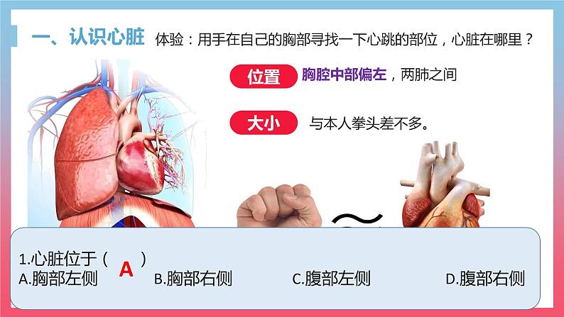 体验:用手在自己的胸部寻找一下心跳的部位,心脏在哪里?