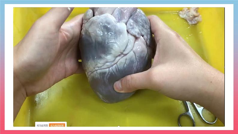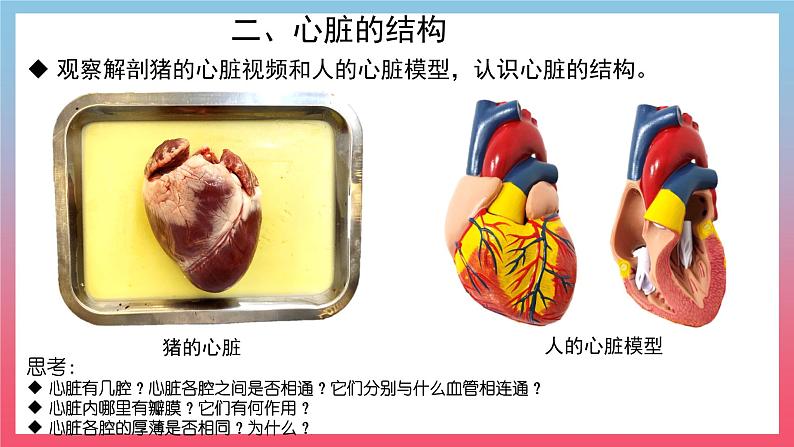 观察解剖猪的心脏视频和人的心脏模型,认识心脏的结构。