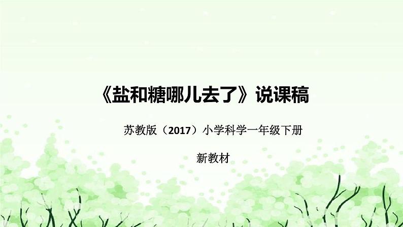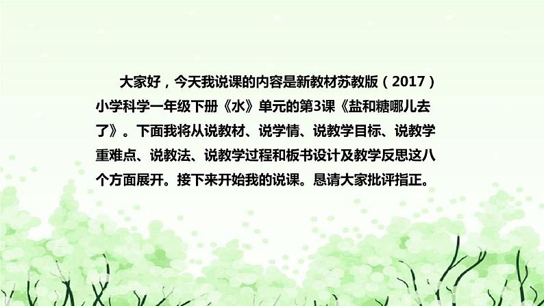 展开大家好,今天我说课的内容是新教材苏教版(2017)小学科学一年级下册《水》单元的第3课《盐和糖哪儿去了》。下面我将从说教材、说学情、说教学目标、说教学重难点、说教法、说教学过程和板书设计及教学反思这八个方面展开。接下来开始我的说课。恳请大家批评指正。