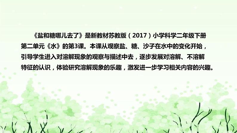 《盐和糖哪儿去了》是新教材苏教版(2017)小学科学二年级下册第二单元《水》的第3课。本课从观察盐、糖、沙子在水中的变化开始,引导学生进入对溶解现象的观察与描述中去,逐步发展对溶解、不溶解特征的认识,体验研究溶解现象的乐趣,激发进一步学习相关内容的兴趣。