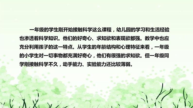 一年级的学生刚开始接触科学这么课程,幼儿园的学习和生活经验也渗透着科学知识。他们的好奇心、求知欲和表现欲都强。教学中也应充分利用孩子的这一特点。从学生的年龄结构和心理特征来看,一年级的小学生对一切事物都充满好奇心,他们有很强的求知欲。但一年级同学刚接触科学不久,动手能力、实验能力还比较薄弱。