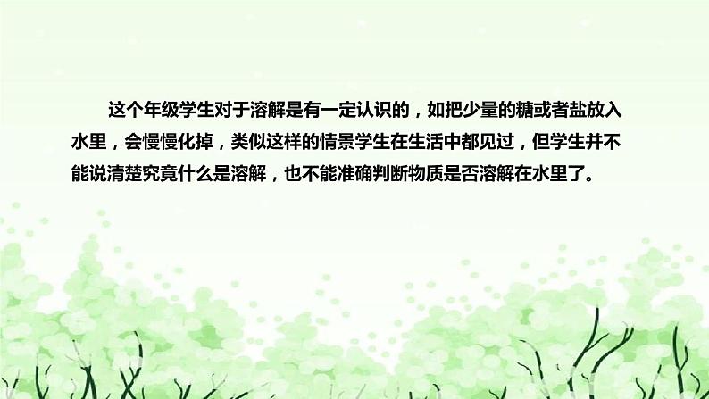 这个年级学生对于溶解是有一定认识的,如把少量的糖或者盐放入水里,会慢慢化掉,类似这样的情景学生在生活中都见过,但学生并不能说清楚究竟什么是溶解,也不能准确判断物质是否溶解在水里了。