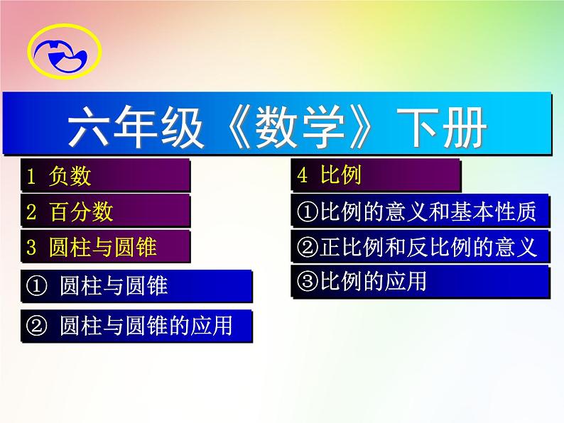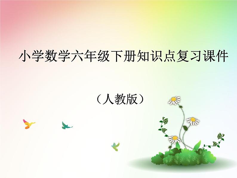 展开小学数学六年级下册知识点复习课件 (人教版)六年级《数学》下册1 负数3 圆柱与圆锥4 比例① 圆柱与圆锥② 圆柱与圆锥的应用①比例的意义和基本性质 ②正比例和反比例的意义 ③比例的应用 2 百分数 第一章 负数(The Negative) 观察气温计4℃0℃零上4℃零下4℃上海南京北京 0℃零上4℃零下4℃上海南京北京记作:+4 ℃ (或4℃)记作:-4 ℃ +4 0℃赤道北极南极( )( )( )-26℃-4 0℃或4 0℃ 在我国的有些地区,它在同一天内,也会产生较大的温差。你们有没有听说过“早穿皮袄午穿纱,围着火炉吃西瓜”这句话,这是对我国海拔最低的新疆吐鲁番盆地一天中气温变化的形象描述。在那里,9月份清晨的最低气温经常下降到0℃以下,中午的最高气温又经常上升到40℃以上,一天中忽而炎炎烈日,转而集风飘雪,令人难以琢磨。你知道吗? 珠穆朗玛峰大约比海平面高8844米,吐鲁番盆地大约比海平面低155米。( )米( )米海平面-155+8844 海拔( )米海拔( )米+3193-400 复习课件读一读下面的海拔高度,他们是高于海平面还是低于海平面?正数大于0,负数小于0。0 先读一读,再把这些数填入相应的框内。 复习课件+9-8+2005-120-16写出5个正数和5个负数。练习: 叔叔上五楼开会,阿姨到地下二楼取车,他们分别应按电梯里的哪个键? -120+1400 选择合适的温度连一连。 -5-2-10124你会填一填读一读吗?深圳拥有轿车的家庭占全部家庭的百分之六十五。1985年,西部儿童入学率为百分之二十四 ;2005年,入学率达百分之九十二。大学生毕业生中,自己创业的达到百分之十九点三。今年家庭的收入是去年的百分之一百五十。某种钙奶含钙百分之三点七。今天,某商场九折(按原价钱的百分之九十)出售商品。某种布料含棉百分之一百。 益多教育中心 第二章 百分数 一、生活中的百分数总学生数三好学生数六年级100人17人五年级200人30人 哪个年级三好学生占 全年级学生的比率大? 在生产、工作和生活中,进行调查统计、分析比较时,经常要用到百分数。==> 一个工厂从第一批产品中抽出500件,经检验,有490件合格。由此推算出这批产品合格的比率是 ,也可以写成( )。表示什么?表示合格产品是产品总数的百分之九十八。想一想、说一说, 、 、 都表示什么? 表示一个数是另一个数的百分之几。结论: 表示一个数是另一个数的百分之几的数,叫做百分数。百分数也叫百分率或百分比。讨论: 百分数表示两数之间的什么关系?应不应有单位名称?二、百分数应该用什么形式表示呢?(1)写法:写百分数时,通常不写成分数形式,而采用%表示。写百分数时,去掉分数线和分母,在分子后面添上百分号。例如:百分之九十 写作 90%百分之六十四 写作 64%百分之一百零八点五 写作 108.5%(2)读法:读百分数时,只要把百分数看作分母是100,百分号前面的数看作分子,就可以和分数一样读了. 例如:75% 读作: 百分之七十五. 150% 读作: 百分之一百五十. 0.8% 读作: 百分之零点八.百分数与分数的联系与区别:(1)本班女生占全班人数的48%.(2)一根电线长 米.(3)面粉重量是大米的 .结论: 百分数是分数中的一种情况.分数既可以表示一个具 体数量,又可以表示一个数是另一个数的几分之几,所以分数后面既可以有单位,也可以没有单位,而百分数只表示两数之间的倍数关系,所以没有计量单位.讨 论百发百中十拿九稳百里挑一一分为二百战百胜半壁江山100%90%1%50%100%50%根据成语写出相关的百分数. 第三章 圆柱和圆锥 一、生活中的圆柱和圆锥 第三章 圆柱和圆锥 一、生活中的圆柱和圆锥 第三章 圆柱和圆锥2、圆柱相关公式 第三章 圆柱和圆锥2、圆锥定义及特性顶点侧面底面侧面积 第三章 圆柱和圆锥2、圆锥相关公式L知不知道?⒈做一个圆柱形铁皮罐头盒,求需要多少铁 皮,是求它的( );罐头盒周围要贴商标纸,求商标纸的面积,是求它的( ),求罐头盒可以装多少东西,是求它的( )。表面积侧面积 容 积⒉求圆锥体的大豆堆约占多大空间是求圆锥的( ) 体积 第三章 圆柱和圆锥三、习题应用题 第三章 圆柱和圆锥三、习题3.一张长方形的铁皮,长12.56分米,宽6.28分米,用这张铁皮卷成一个圆柱形的铁皮水桶的侧面,另配一个底面,怎样卷这张铁皮才能使制成的水桶装水最多?(接头处,铁皮的厚度不计。)4.有一囤稻谷,上面是圆锥形,下面是圆柱形,量得圆柱的底面周长是6.28米,高2米,圆锥的高是0.3米,这囤稻谷重多少千克?(每立方米稻谷种650千克)5.一段圆柱木棍长4米,底面半径是20厘米,(1)把它平均分成三段后,表面积增加了多少平方厘米?(2)将它沿直径切开,表面积增加多少?思考题 第三章 圆柱和圆锥三、习题 第四章 比例◆ 思考—提问买了四个苹果,吃了一部分,你能想到什么?吃了1个吃了2个吃了3个吃了4个剩3个剩2个剩1个剩0个吃了的和剩下的是不是有相关联的量? ◆ 思考—提问在实际生活中两种相关的量是很多的,例如总价和单价是两种相联的量,总价和数量也是两种相关联的量.你还能举出一些例子吗?例如:总价和单价是两种相关联的量,总价和数量也是两种相关联的量。 一、比例比例:表示两个比相等的式子。如: 一、比例观察:内项相乘=?外项相乘=?内项之积=外项之积 一、比例内项之积=外项之积 ◆ 比例练习 ◆ 比例练习 趣味奥数: 哥哥和弟弟两人3年后年龄和是27岁,弟弟今年的年龄正好是哥哥和弟弟两人年龄的差。哥哥和弟弟今年各多少岁? 7123 二、正比例一列火车行
