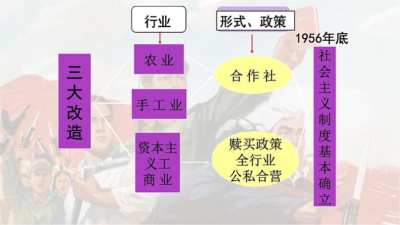 这是一份历史八年级下册第二单元 社会主义制度的建立与社会主义建设的探索第6课 艰辛探索与建设成就完美版课件ppt,共42页。PPT课件主要包含了三大改造,手工业,资本主义工商业,公私合营,社会主义制度确立,进入社会主义初级阶段,目标导航,知识结构,“文化大革命”,建设成就等内容,欢迎下载使用。