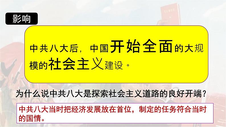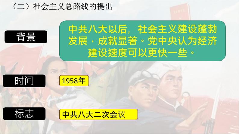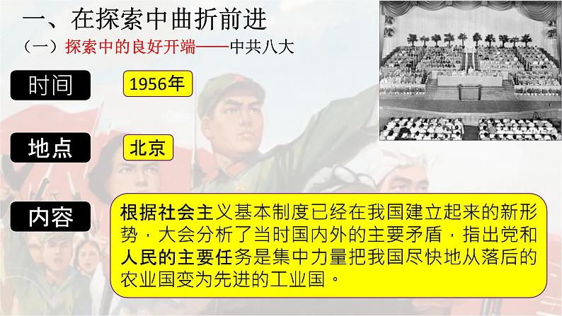 这是一份人教部编版八年级下册第6课 艰辛探索与建设成就课文配套ppt课件,共26页。PPT课件主要包含了学习重点,学习难点,中共八大,主要矛盾,“大跃进”运动,主要标志,农业上浮夸风,工业上全民炼钢,人民公社化运动,启示教训等内容,欢迎下载使用。