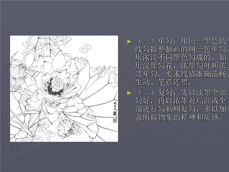 初中美术浙美版七年级上册6 出水芙蓉一等奖ppt课件: 这是一份初中美术浙美版七年级上册6 出水芙蓉一等奖ppt课件,共35页。PPT课件主要包含了工笔白描等内容,欢迎下载使用。