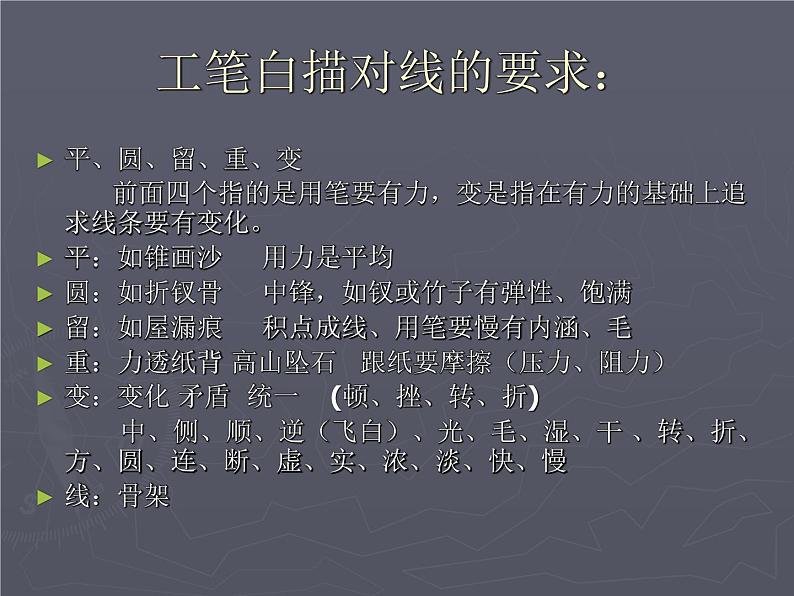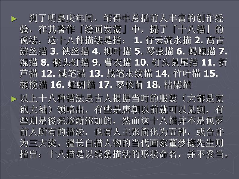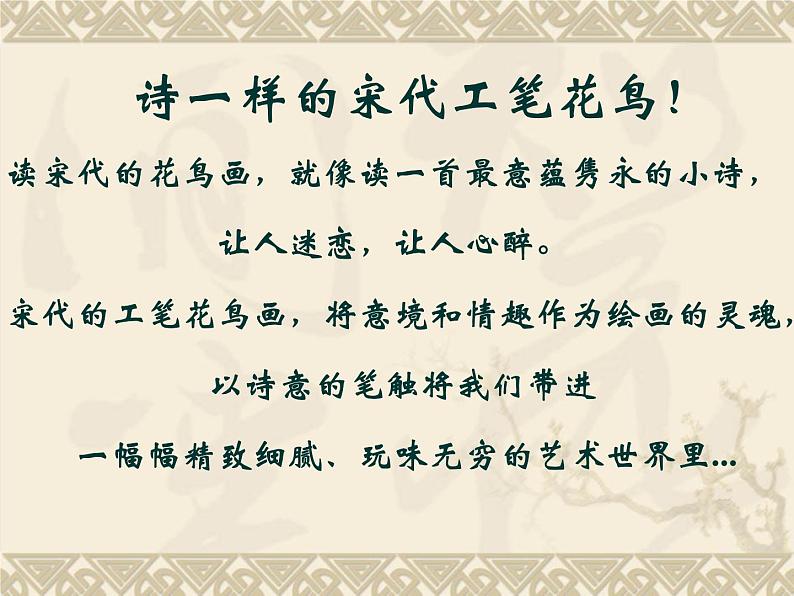 2、在良好的文化情境中学习中国画,培养审美能力和对中国画的鉴赏能力,提高人文素养,同时在教学过程中培养学生收集处理信息的能力。