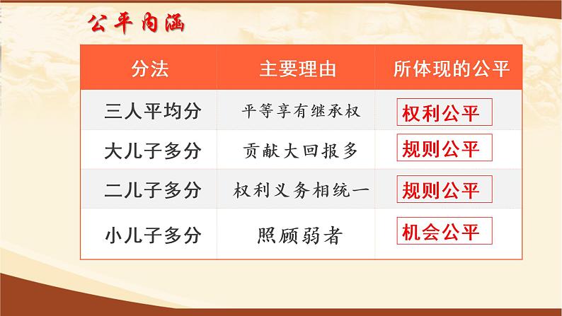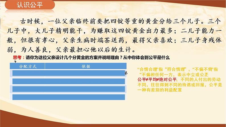思考:请你为这位父亲设计几个分黄金的方案并说明理由?从中你体会到公平是什么?
