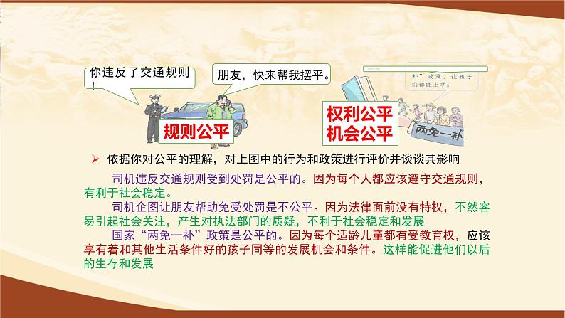 司机违反交通规则受到处罚是公平的。因为每个人都应该遵守交通规则,有利于社会稳定。司机企图让朋友帮助免受处罚是不公平。因为法律面前没有特权,不然容易引起社会关注,产生对执法部门的质疑,不利于社会稳定和发展国家“两免一补”政策是公平的。因为每个适龄儿童都有受教育权,应该享有着和其他生活条件好的孩子同等的发展机会和条件。这样能促进他们以后的生存和发展