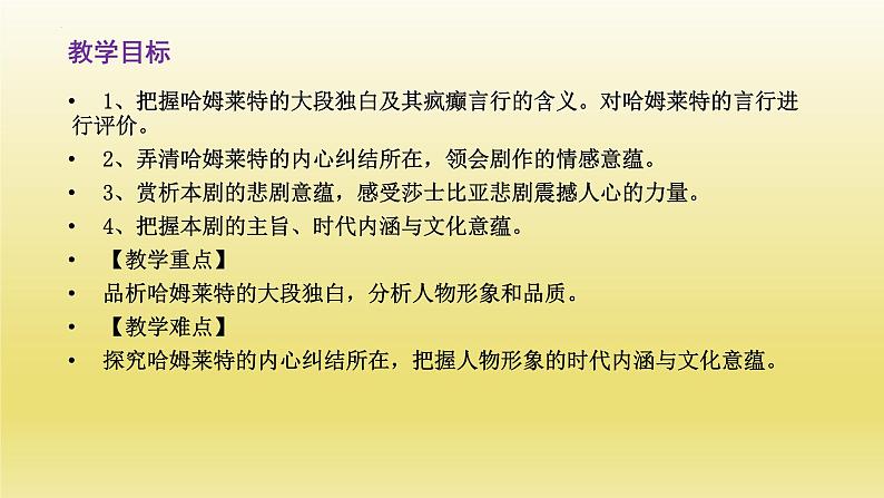 1、把握哈姆莱特的大段独白及其疯癫言行的含义。对哈姆莱特的言行进行评价。2、弄清哈姆莱特的内心纠结所在,领会剧作的情感意蕴。 3、赏析本剧的悲剧意蕴,感受莎士比亚悲剧震撼人心的力量。4、把握本剧的主旨、时代内涵与文化意蕴。 【教学重点】品析哈姆莱特的大段独白,分析人物形象和品质。【教学难点】探究哈姆莱特的内心纠结所在,把握人物形象的时代内涵与文化意蕴。