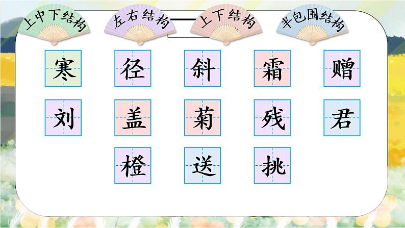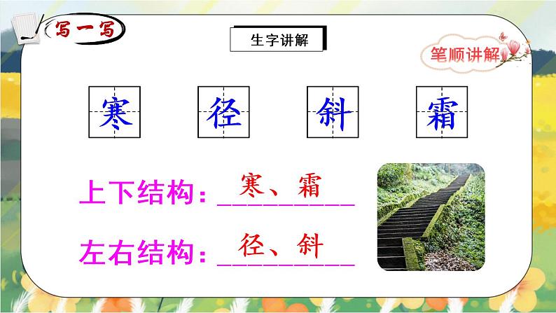教学目标 | 1.认识“径、斜”等10个生字,读准多音字“挑”,会写“寒、径”等13个生字。 2.有感情地朗读课文,背诵3首古诗,默写《山行》。 3.能借助注释,大致理解诗句的意思。能从古诗中描绘的景象知道古诗描写的季节。 |