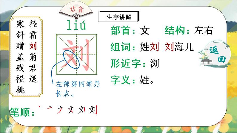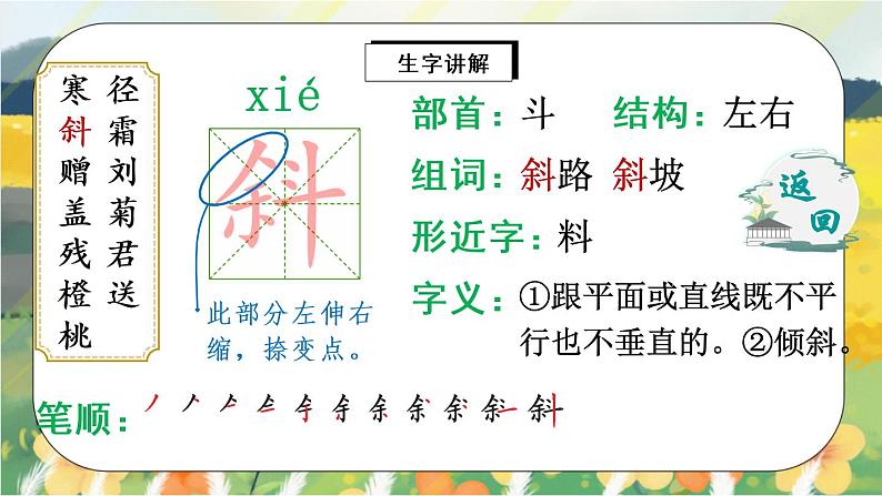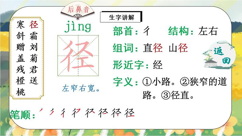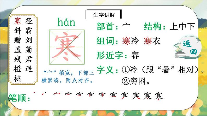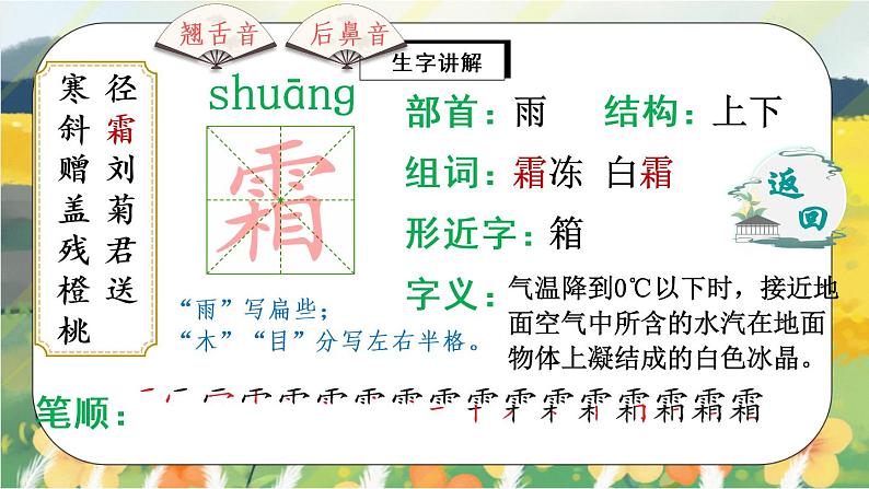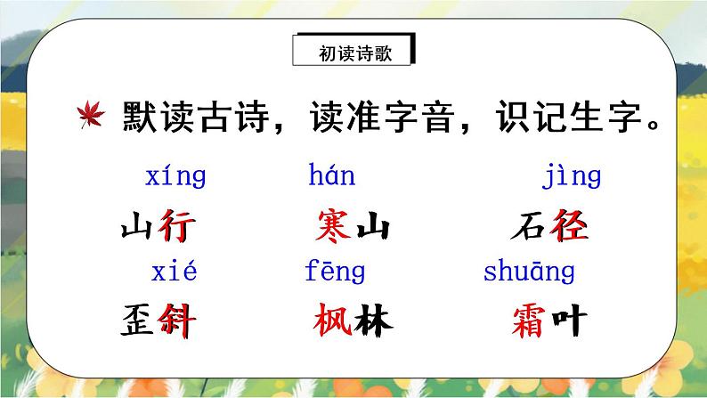 教学重点 | 1.认识“径、斜”等10个生字,读准多音字“挑”,会写“寒、径”等13个生字。 2.有感情地朗读课文,背诵3首古诗,默写《山行》。 |