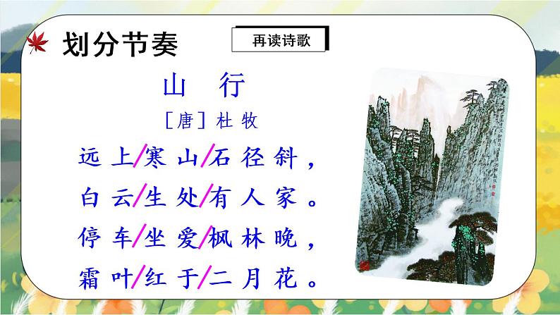 教学过程 | 第一课时 一、激情导入,揭示课题 1.出示秋天的图片,明确单元主题,引导学生形成单元整体印象,从单元整体学习目标过渡到课文学习。 导语:同学们,说到秋天,你们的脑海里会浮现怎样的画面?我们每个人对秋都有不同的发现和感受,秋天真是一个多姿多彩的季节!今天我们就要踏上一个新的单元学习之旅,主题就是“金秋时节”。在本单元的学习中,我们将吟诵秋天的诗歌,描绘秋天的画卷,感知秋天的气息,聆听秋天的声音,从而感受到秋天的美好。与此同时,我们还将学会一项新的语文阅读技能,那就是了解并运用多种方法去理解难懂的词语。现在,就让我们穿越回古代,一起去看看古人眼里的秋天吧! 2.播放朗读音频,学生听读三首古诗,观赏插图,进入古诗情境。 3.课件出示《山行》。齐读诗歌,理解诗题。 二、初读课文,检测预习 1.指名学生介绍作者。 杜牧(803—852) 唐代诗人。字牧之,号樊川,京兆万年(今陕西西安)人。有诗文集《樊川文集》传世。他的诗豪放、旷达、俊逸,七律和七绝都写得很成功,而七绝尤为凝练、自然,很多名篇为后人所传诵。由于他在诗歌方面成就较高,后人把他与杜甫相提,称他为“小杜”,与李商隐并提,合称为“小李杜”。 2.学生自由朗读,小组交流。课件出示阅读交流的要求。 (1)读准字音,识记生字。 (2)圈出不理解的词语,小组交流。 3.检查交流情况,重点解决生字识记、书写。 识字方法:注意读准翘舌音“霜”,前鼻音“寒”,后鼻音“行、径”。“行”是多音字,进行组词造句练习。“寒、径、霜”可以运用形近字辨析的方法进行识记。“斜”可以运用生字加减法进行记忆。 4.教师示范朗读,学生尝试划分节奏,吟诵诗歌。 远上/寒山/石径斜,白云/生处/有人家。停车/坐爱/枫林晚,霜叶/红于/二月花。 三、再读课文,整体感知 1.出示诗文配图,引导探究。 (1)仔细观察图画,在诗中可以找到哪些景物? (2)你知道作者在山中行走时是什么季节吗?画面和诗句中哪些地方告诉了我们季节呢? (3)这么多的景物中,最吸引作者的是什么?这种景物有什么特点? (4)美丽的枫林晚景使得诗人难以抑制自己的惊喜,哪个字直抒胸臆?诗人的什么动作表现出了这份惊喜? 2.看图想象,引导学生按一定顺序说说图画上的内容。 示例:走进深秋的山林,远望,一条山路弯弯曲曲向山顶延伸,山腰上云雾袅绕,隐约还有几户山居人家;近处,夕阳晚照,枫林似火,动人心魄。这真是一幅动人的山林秋色图! 四、品读欣赏,深入探究 (一)教师“扶”学“远上寒山石径斜”。 1.理解“远上寒山”的意思。诗人为何称这山为“寒山”?(深秋时节,山上草木枯黄,给人一种凉意,故称寒山。)这石头小路有什么特点?(曲折不直。)它伸向哪儿?(山顶。) 2.引导学生想象画面,串讲句意。教师相机点拨总结。 示例:深秋时节,一条弯弯曲曲的小路蜿蜒伸向山顶。 方法拓展:古诗的语言极为精练,跟现代文的表达不同。我们在说诗句意思的时候,可以先想象诗句描述的画面,再结合诗句中重要字词的意思,把句意说完整、说清楚。如果运用直译法,也并非逐字逐句进行翻译,还要调整表述顺序,使句意更加流畅才行。 (二)半“扶”半“放”学“白云生处有人家”一句。 1.引导学生想象描述画面。行走在山间小路上,你仿佛听到了什么?看到了什么? 所见:山高之处,云雾缭绕,炊烟袅袅。 所闻:风吟,鸟啼,鸡鸣,犬吠。 所感:寂静的深山仍让人感到乡野生活的恬淡闲适,充满生气。 2.比较“生处”“深处”“升处”的差异,突破“生处”难点、易错点。 3.串讲前两句诗意。朗读回顾,读出画面感。 (三)“放手”合作学习“停车坐爱枫林晚,霜叶红于二月花”。 1.自由读第3、4句,想象画面。 2.结合图片,交流“坐”“晚”“霜叶”“红于”的意思。 3.学生用“之所以……是因为……”的句式说说这两句诗描绘的画面,串讲诗意。 4.朗读回顾,读出喜爱之情。 小结:火红的枫林,火红的枫叶,是那么生机勃勃,丝毫看不出要走进冬天、走向衰败的痕迹。这怎能不叫人心生赞叹啊!同学们,让我听听你们满怀热情的朗诵,听听你们内心和诗人一样的喜爱之情。