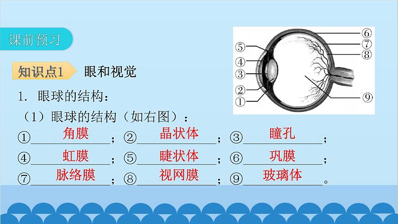 初中生物人教版 (新课标)七年级下册第四单元 生物圈中的人第六章 人体生命活动的调节第一节 人体对外界环境的感知教学课件ppt: 这是一份初中生物人教版 (新课标)七年级下册第四单元 生物圈中的人第六章 人体生命活动的调节第一节 人体对外界环境的感知教学课件ppt,共45页。PPT课件主要包含了课前预习,易错点拨,素养提升,学习目标,课堂演练,晶状体,睫状体,脉络膜,视网膜,玻璃体等内容,欢迎下载使用。