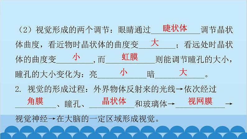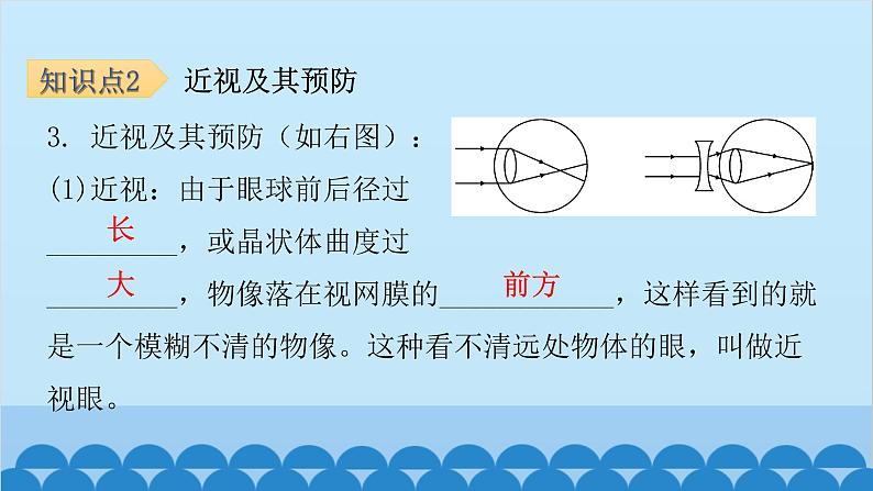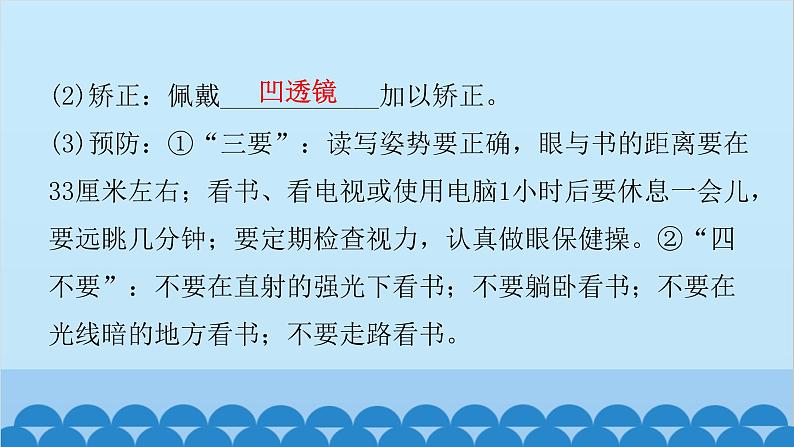 (2)矫正:佩戴____________加以矫正。(3)预防:①“三要”:读写姿势要正确,眼与书的距离要在33厘米左右;看书、看电视或使用电脑1小时后要休息一会儿,要远眺几分钟;要定期检查视力,认真做眼保健操。②“四不要”:不要在直射的强光下看书;不要躺卧看书;不要在光线暗的地方看书;不要走路看书。