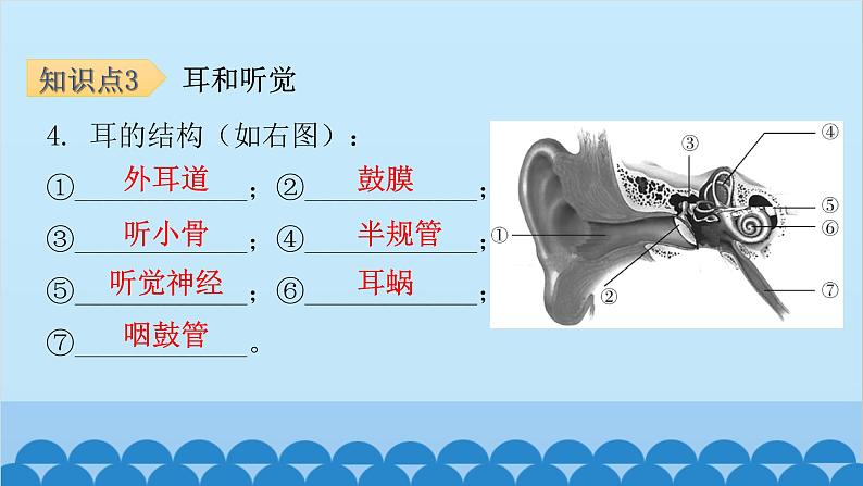 5. 听觉的形成:声波→外耳道→____________→听小骨→____________(刺激了耳蜗中对声波敏感的感觉细胞)→听觉神经→大脑的一定区域(____________中枢)→产生听觉。