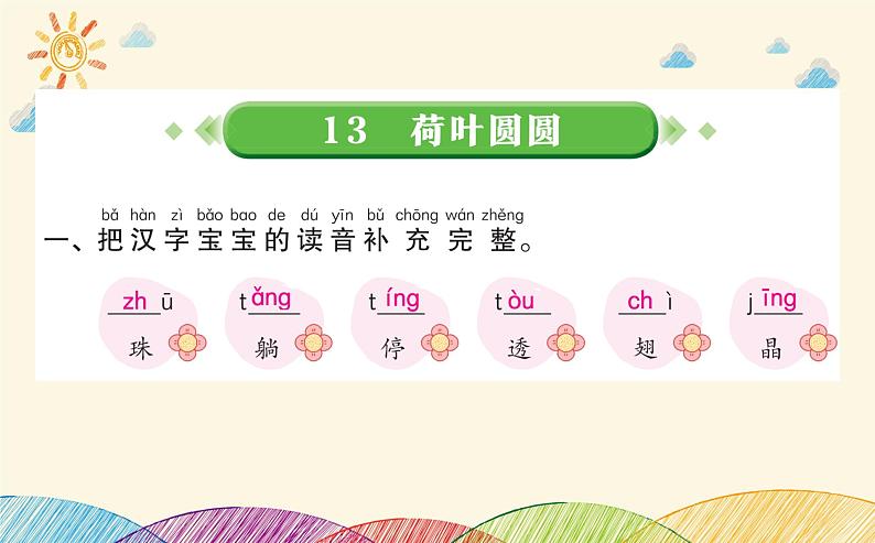这是一份一年级下册13 荷叶圆圆图片课件ppt,共24页。PPT课件主要包含了亮晶晶,笑嘻嘻,停机坪,读划圈等内容,欢迎下载使用。
