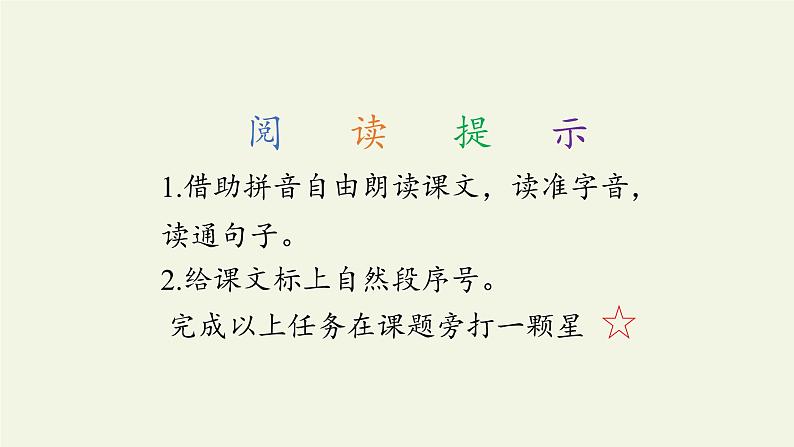 1.借助拼音自由朗读课文,读准字音,读通句子。2.给课文标上自然段序号。 完成以上任务在课题旁打一颗星
