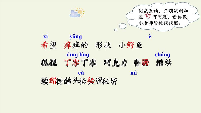 希望 痒痒的 形状 小鳄鱼 狐狸 丁零丁零 巧克力 香肠 继续 糖醋 抬头 秘密