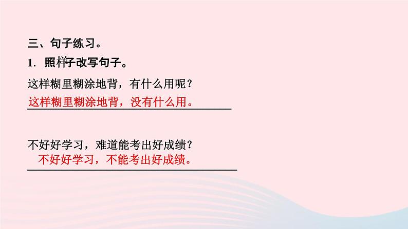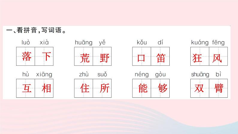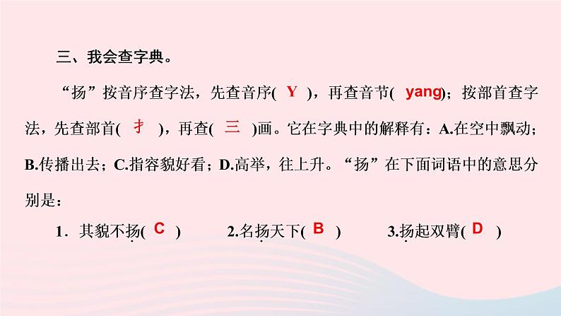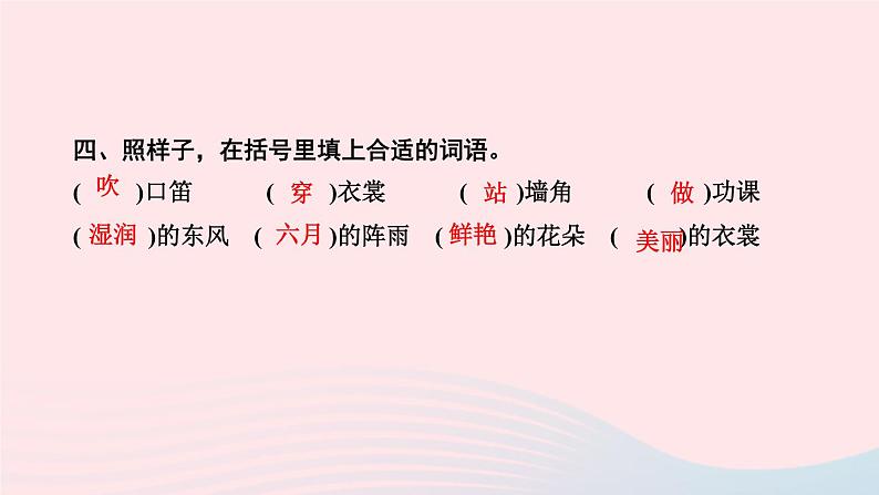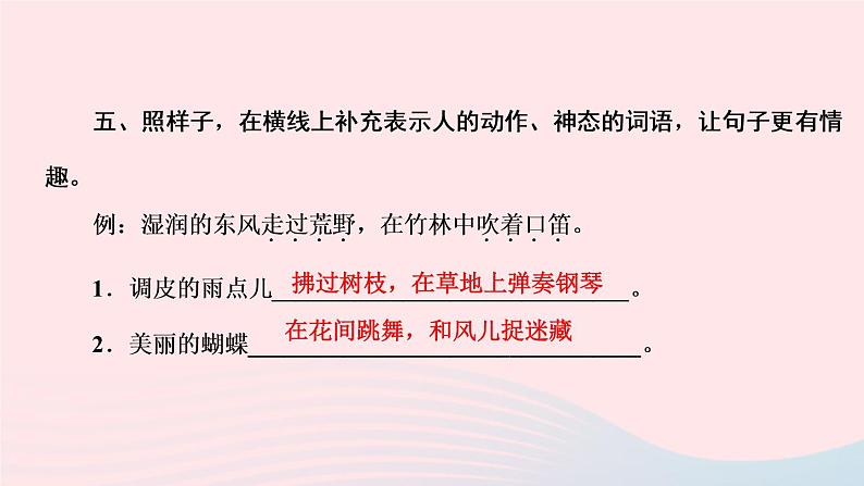 2 花的学校 落 下荒 野口 笛狂 风互 相住 所能 够双 臂jiàjiàjiàjiàjiǎjiǎjiǎjiǎ四三Y yang 扌 三 C B D 四、照样子,在括号里填上合适的词语。( )口笛 ( )衣裳 ( )墙角 ( )功课( )的东风 ( )的阵雨 ( )的花朵 ( )的衣裳吹穿站做湿润六月鲜艳美丽拂过树枝,在草地上弹奏钢琴 在花间跳舞,和风儿捉迷藏 六、阅读语段,完成练习。①妈妈,我真的觉得那些花朵是在地下的学校里上学。②他们关了门做功课。如果他们想在放学以前出来游戏,他们的老师是要罚他们站墙角的。BA花孩子跳起了舞和蝴蝶做游戏3.圈出文段④中描写动作的词语,想一想,这些词语表现出了什么?( )(多选)A.营造出了一种热烈的场面。B.说明孩子们是偷偷跑出来的。C.写出了孩子们对自由生活的向往和高兴的心情。D.表现出环境的恶劣。AC七、课外阅读。假如我变成了一朵金色花,为了好玩,长在树的高枝上,笑嘻嘻地在空中摇摆,又在新叶上跳舞,妈妈,你会认识我吗?你要是叫道:“孩子,你在哪里呀?”我暗暗地在那里匿(nì)笑,却一声儿不响。……当你吃过午饭,坐在窗前读书,那棵树的阴影落在你的头发与膝上时,我便要将我小小的影子投在你的书页上,正投在你所读的地方。但是你会猜得出这就是你孩子的小小影子吗?当你黄昏时拿了灯到牛棚里去,我便要突然地再落到地上来,又成了你的孩子,求你讲故事给我听。“你到哪里去了,你这坏孩子?”“我不告诉你,妈妈。”这就是你同我那时所要说的话了。1.照样子,写词语。笑嘻嘻(ABB式) _________ __________兴冲冲乐呵呵2.短文抓住两个画面来写“我”和妈妈捉迷藏,这两个画面分别是( )和( )A.妈妈买菜回来,我突然出现。B.妈妈读书时,我将影子投在书页上。C.妈妈画画时,我用花瓣散发香气。D.妈妈拿灯去牛棚时,我跳到妈妈面前,恢复原形。BD3.当妈妈见到孩子时,为什么会说“你到哪里去了,你这坏孩子”( )A.因为在妈妈心中,“我”的确是个皮孩子。B.妈妈一天没有见到孩子,突然见到,又惊又喜。B八、结合课文最后一自然段,联系自己的生活实际想一想,花孩子们“扬起双臂”要对妈妈说什么?妈妈会怎么招呼他们?________________________________________________________________________________________________________________________________示例:妈妈,我回来了,我今天做了好玩的游戏,好开心啊!孩子,你回来了,来跟妈妈讲一讲,今天都有什么开心的事?