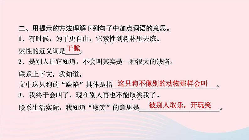 14* 小狗学叫 √ √ √ √ √ √ √ √ 干脆 这只狗不像别的动物那样会叫 被别人取乐,开玩笑 鲜艳 迷人 芳香 以后的困难再大 我 不会退缩 四、(关键问题)故事的几种结局可能是怎样的?选择一种写一写。第一种结局:狗跑啊,跑啊,它跑到了一片草地上,一头小母牛正在那里安详地吃草。第二种结局:狗跑啊,跑啊,它碰上了一个农民。第三种结局:狗跑啊,跑啊,突然停住了,它听见一种奇怪的叫声:“汪汪,汪汪……”小母牛看见小狗非常伤心,当它问清楚原因后,决定教小狗叫。“哞……哞……”小母牛叫一声,小狗也叫一声,不一会儿它就学会了。小狗开心极了!__这个农民说:“我正需要一只狗替我看守鸡舍,你就到我家里来吧!”“可我不会叫。”“那更好,等贼一靠近,你就叼住他们,这比吓跑他们更好。”就这样,这只狗找到了一份工作。__它循着叫声跑去,原来发出这叫声的也是一只狗。这时,它才知道,原来狗是这样叫的。五、(拓展题)猜一猜,故事的结局是怎样的?填一填。猎人在湖边设置了罗网,捕获了很多鸟。鸟多力气大,带着网腾空飞去。猎人见了,在地上紧紧追赶。一位农夫劝他别追,猎人自信地说:“如果是一只鸟,我就不去追;可这是一群鸟,天黑时它们一定会被我一网打尽。”天黑了,……明明:我猜猎人怎么追都追不上,最后只好垂头丧气地回家了,因为__________________________________丽丽:我猜猎人会把鸟儿一网打尽,因为_________________________,________________________________________________鸟多力气大,带着网飞走了。网中是一群鸟,天黑了它们会飞向各自的家,不齐心协力,网会掉下来。