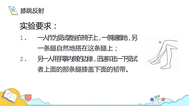 一人作为受试者坐在椅子上,一条腿着地,另一条腿自然地搭在这条腿上;另一人用手掌内侧的边缘,迅速叩击一下受试者上面的那条腿膝盖下面的韧带。