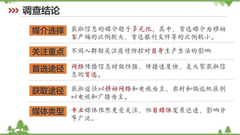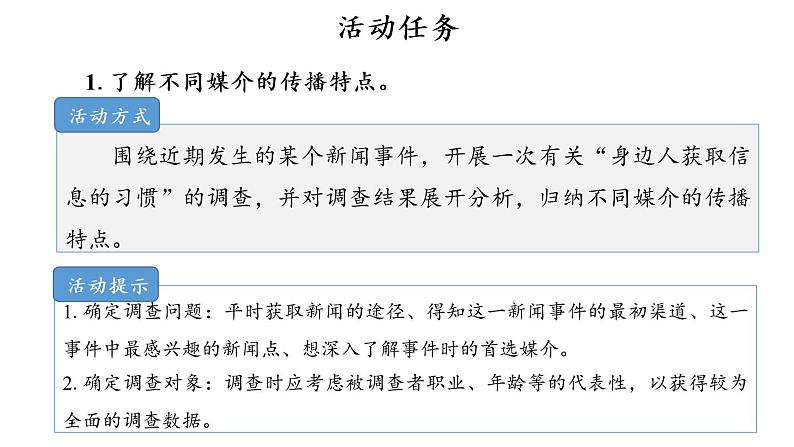 围绕近期发生的某个新闻事件,开展一次有关“身边人获取信息的习惯”的调查,并对调查结果展开分析,归纳不同媒介的传播特点。