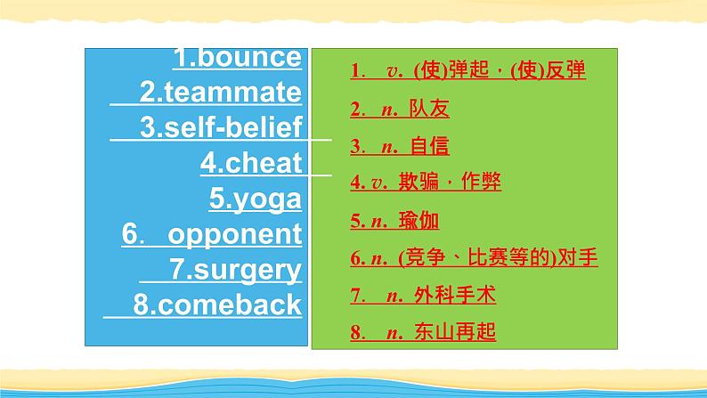 1. v. (使)弹起,(使)反弹2.n. 队友3.n. 自信4. v. 欺骗,作弊5. n. 瑜伽6. n. (竞争、比赛等的)对手7. n. 外科手术8. n. 东山再起