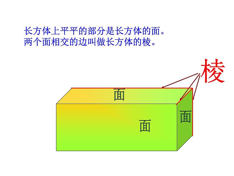 长方体上平平的部分是长方体的面。两个面相交的边叫做长方体的棱。