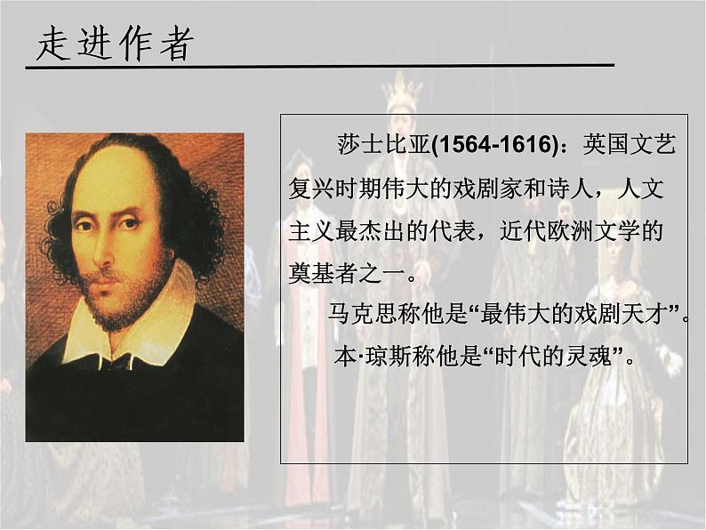 莎士比亚(1564-1616):英国文艺复兴时期伟大的戏剧家和诗人,人文主义最杰出的代表,近代欧洲文学的奠基者之一。 马克思称他是“最伟大的戏剧天才”。 本·琼斯称他是“时代的灵魂”。