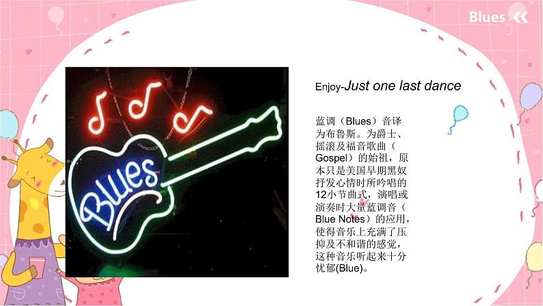 蓝调(Blues)音译为布鲁斯。为爵士、摇滚及福音歌曲(Gspel)的始祖,原本只是美国早期黑奴抒发心情时所吟唱的12小节曲式,演唱或演奏时大量蓝调音(Blue Ntes)的应用,使得音乐上充满了压抑及不和谐的感觉,这种音乐听起来十分忧郁(Blue)。