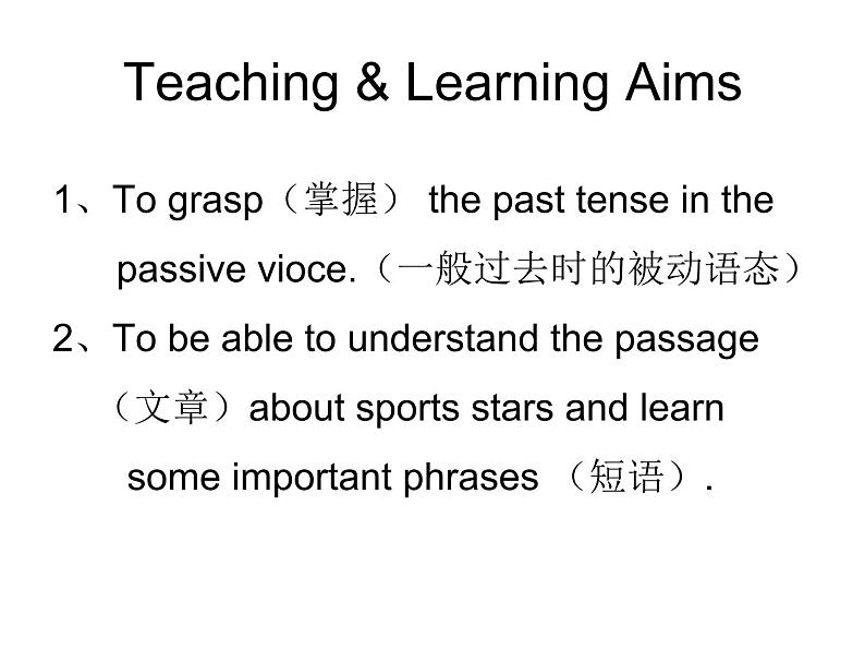 1、T grasp(掌握) the past tense in the passive vice.(一般过去时的被动语态)2、T be able t understand the passage (文章)abut sprts stars and learn sme imprtant phrases (短语).