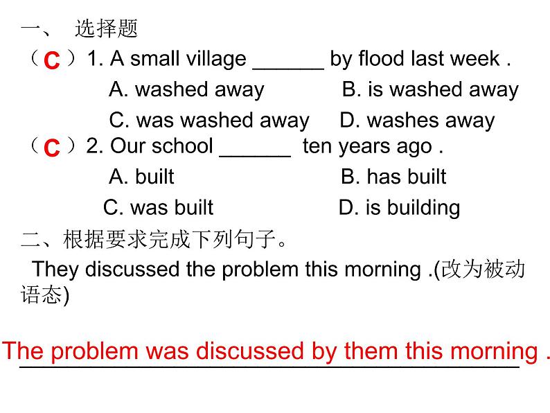 一、 选择题 ( )1. A small village ______ by fld last week . A. washed away B. is washed away C. was washed away D. washes away ( )2. Our schl ______ ten years ag . A. built B. has built C. was built D. is building 二、根据要求完成下列句子。 They discussed the prblem this mrning .(改为被动语态) __________________________________________