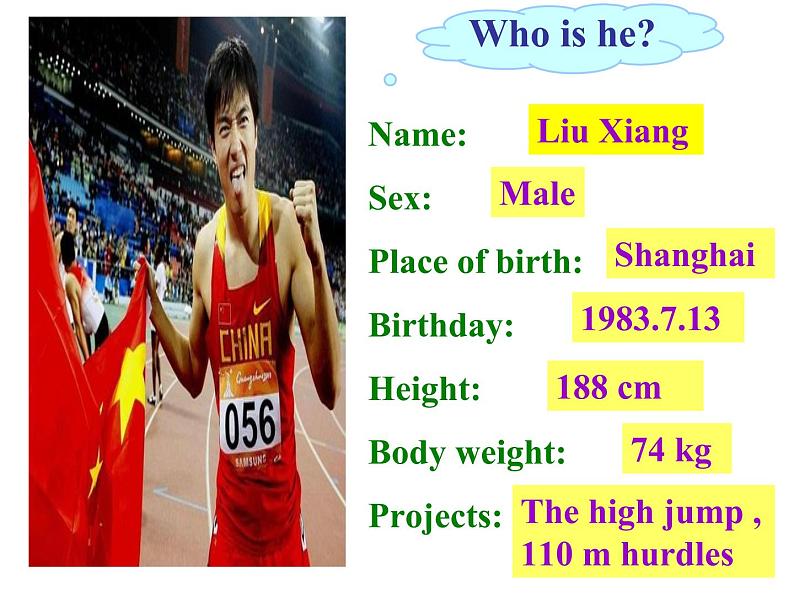 这是一份英语九年级上册Unit 2 He was invited to competitions around the world.集体备课课件ppt,共19页。PPT课件主要包含了Unit 2,Liu Xiang,Male,Shanghai, cm, kg,sports,Task 2,set up,was set up等内容,欢迎下载使用。