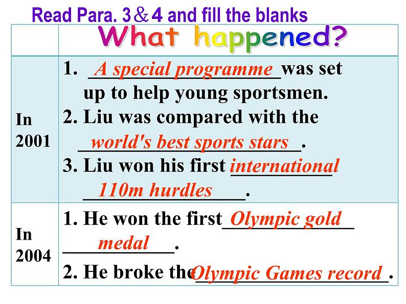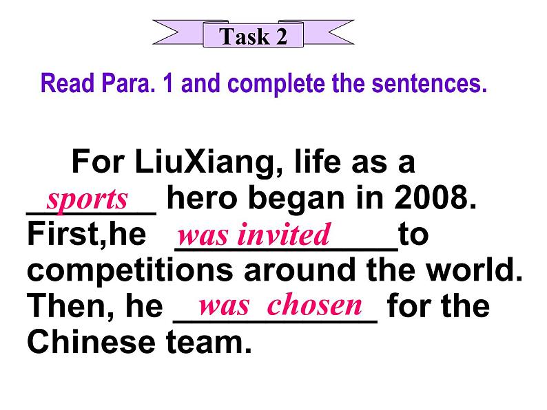 1. Try t search fr mre infrmatin abut Liu Xiang and retell his stry t yur classmate.2. Review the use f the past simple passive vice.