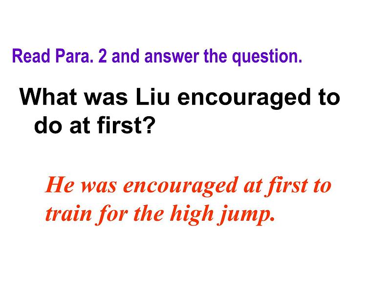1. Liu was encuraged at first t train fr the high jump. 起初,刘(翔)被鼓励参加跳高训练。