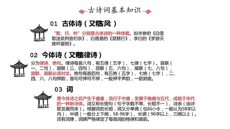 分为律诗、绝句。律诗每首八句,有五律(五字)、七律(七字)。首联(一、二句)、颔联(三、四句)、颈联(五、六句)、尾联(七、八句),颔联、颈联必须对仗。绝句每首四句,有五绝(五字)、七绝(七字),二、四、六、八句押韵,首句可押可不押,一般押平声韵,一韵到底。