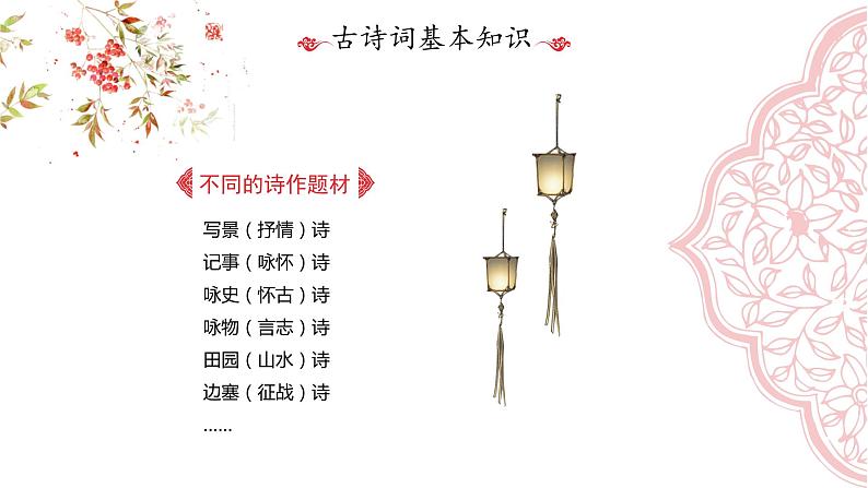 写景(抒情)诗记事(咏怀)诗咏史(怀古)诗咏物(言志)诗田园(山水)诗边塞(征战)诗……