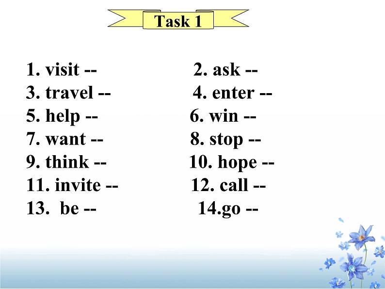 1. visit -- 2. ask -- 3. travel -- 4. enter -- 5. help -- 6. win -- 7. want -- 8. stp --9. think -- 10. hpe -- 11. invite -- 12. call -- 13. be -- 14.g --
