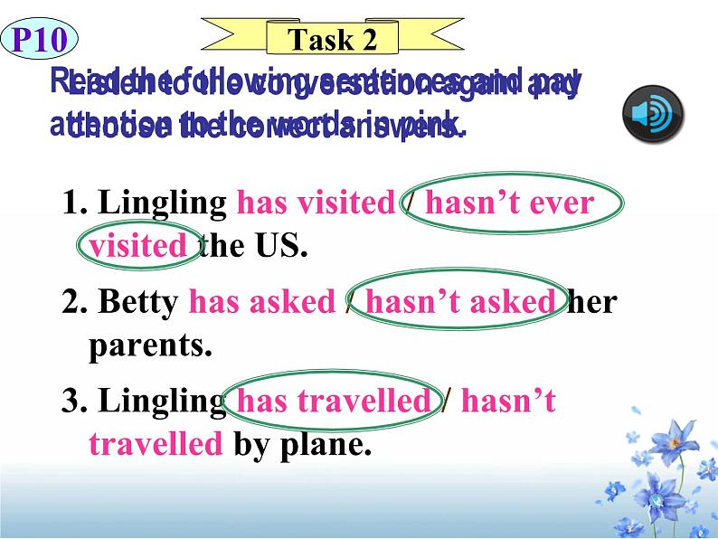 1. Lingling has visited / hasn’t ever visited the US.2. Betty has asked / hasn’t asked her parents. 3. Lingling has travelled / hasn’t travelled by plane.